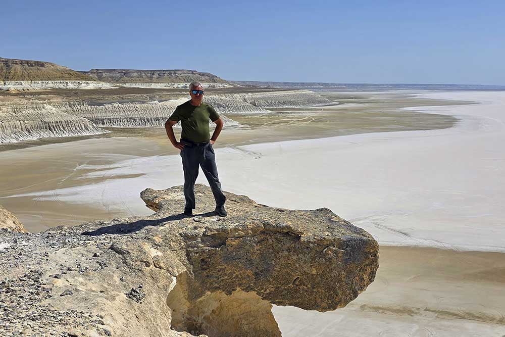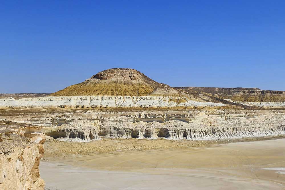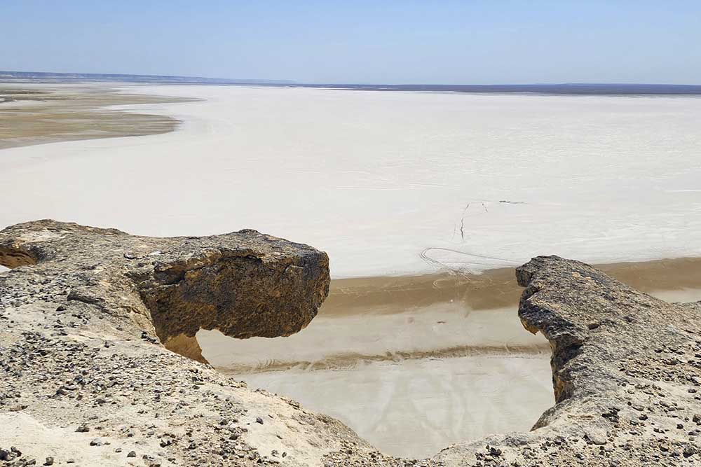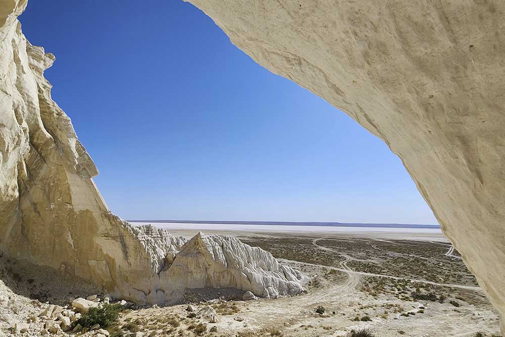 This salt flat (called “sor” in Kazakh) lies in a vast depression stretching up to 222 km in length and 6 km in width, surrounded by steep cliffs reaching heights of up to 80 meters.