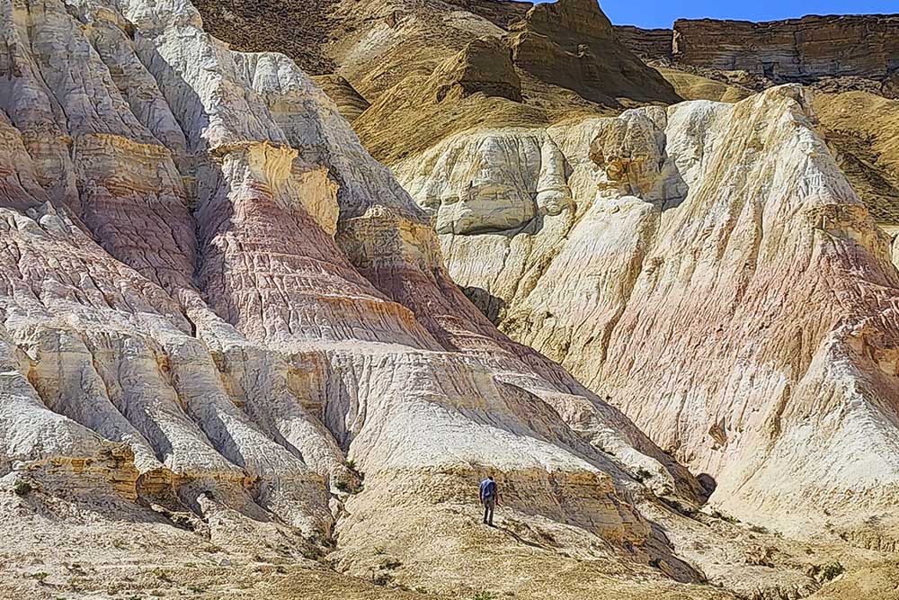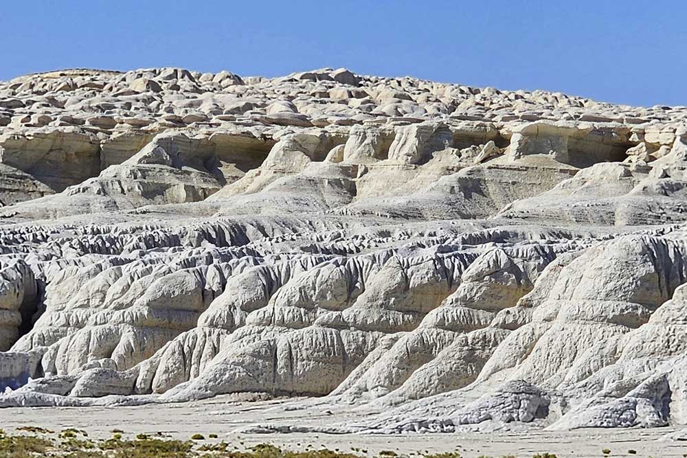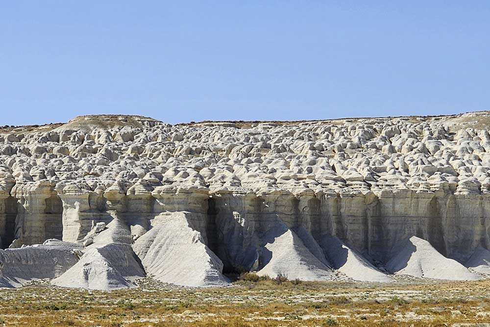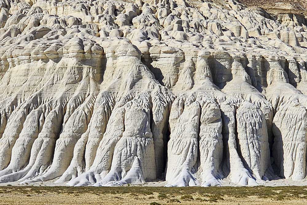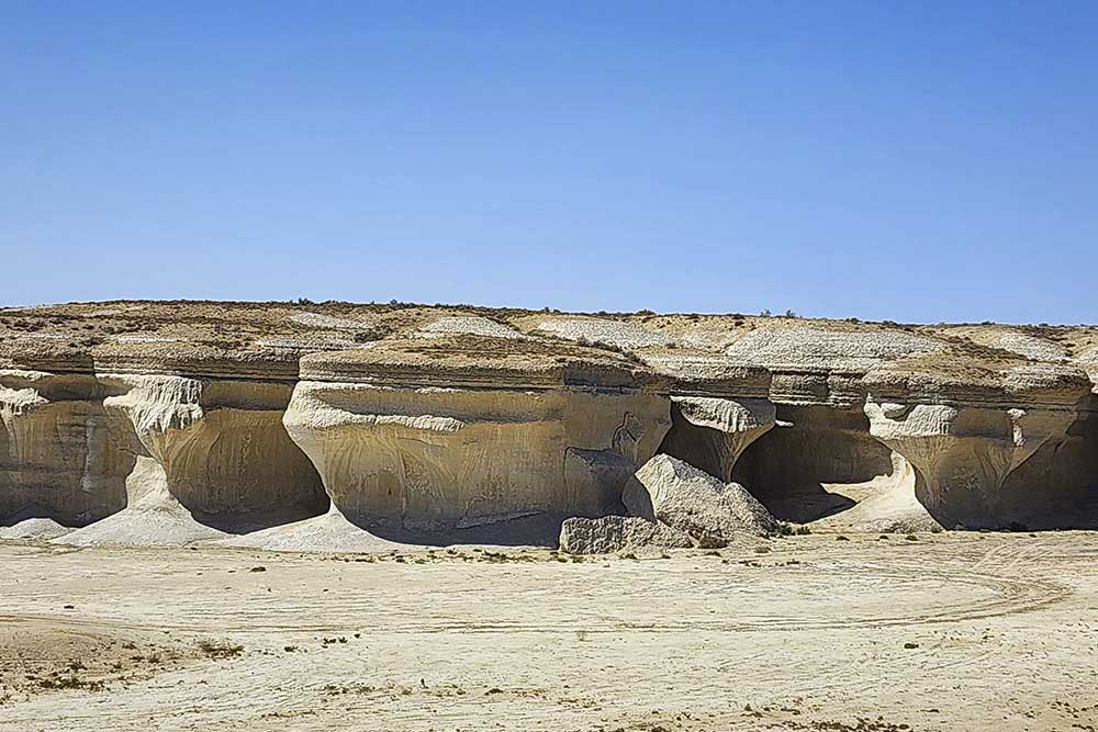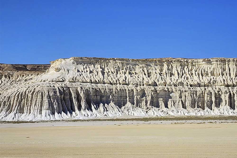 Tuzbair is one of the most famous and photogenic attractions in Mangystau. Its lacy, snow-white chalk cliffs are especially striking. During rainfall, streams of water carve deep channels into the chalk banks, creating fantastical decorations on the slopes that resemble ornate columns, balconies, castles, paws of mythical creatures, exotic trees, and animal faces.