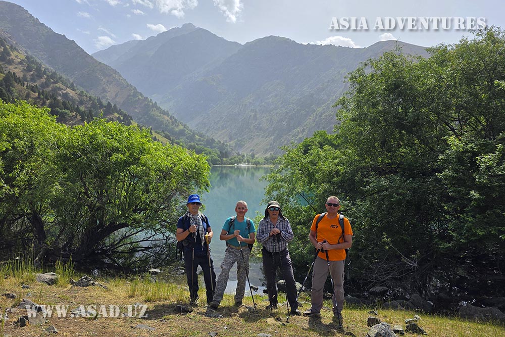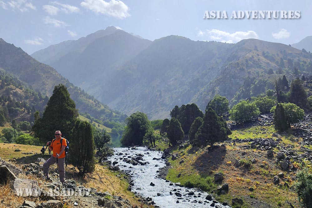 11:00 – Start of the hike (3.5 km one way, +370 m elevation gain, 1.5–2 hours of leisurely walking with photo stops). The well-marked trail begins on the left bank of the Karatag River and climbs steeply to a plateau with juniper forest and alpine meadows. It then gently ascends over a rocky dam that formed the lake. A stunning view of the crystal-clear turquoise lake opens up. After walking another 500 meters along the left bank, enjoying the lake and surrounding views, we reach the river mouth that feeds the lake.